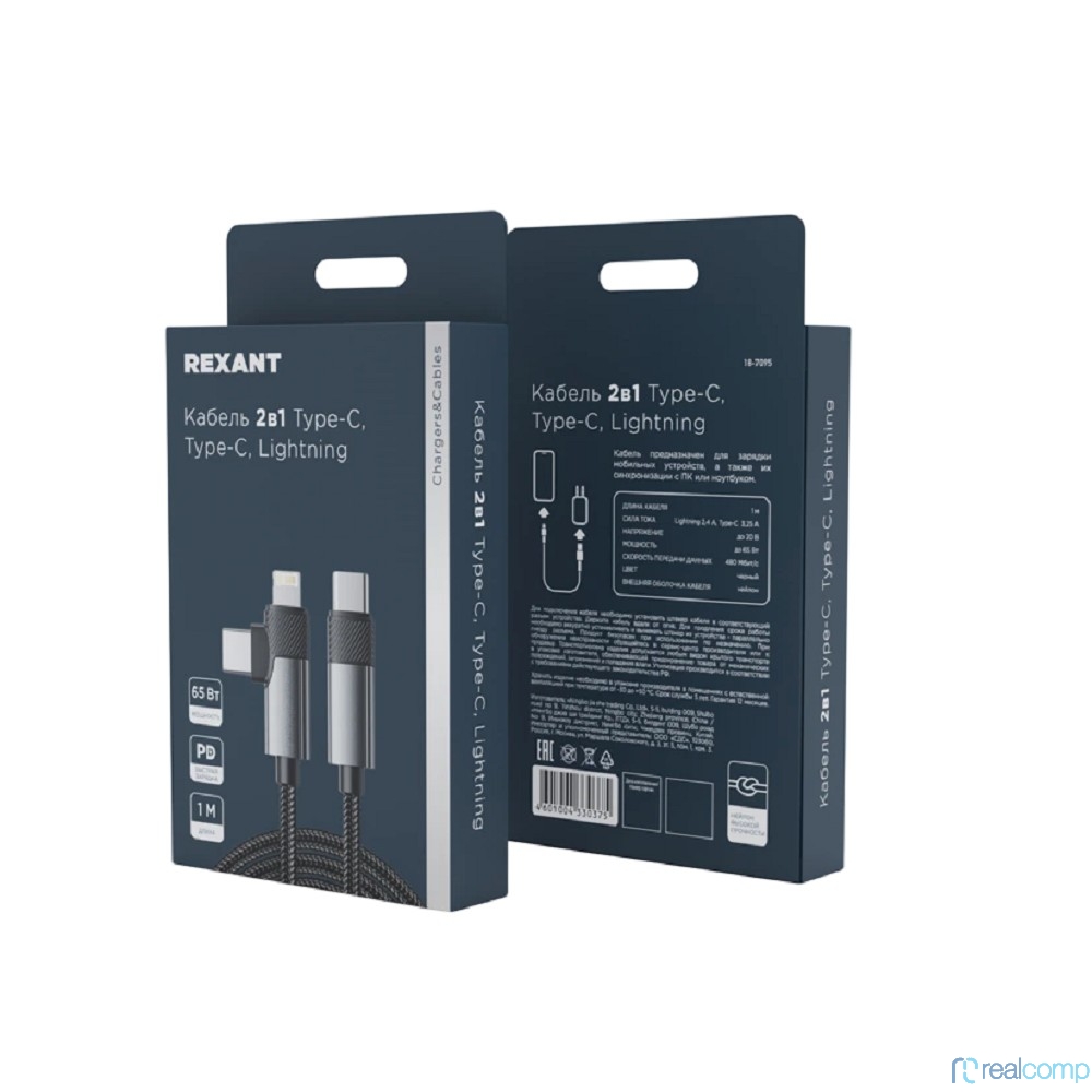 Rexant (18-7095) Кабель 2в1 Type-C, Type-C, Lightning 65Вт, 1м, в черной нейлоновой оплетке