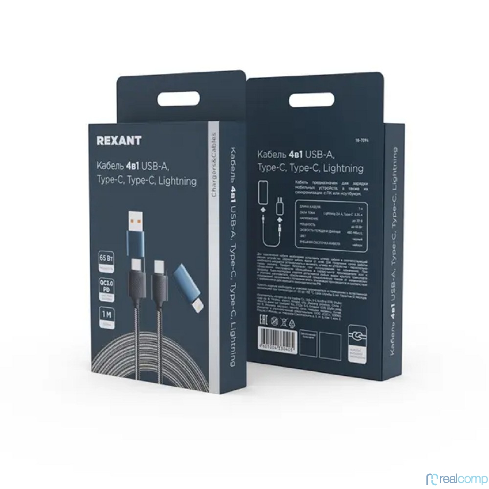 Rexant (18-7094) Кабель 4в1 USB-A, Type-C, Type-C, Lightning 65Вт, 1м, в черной нейлоновой оплетке