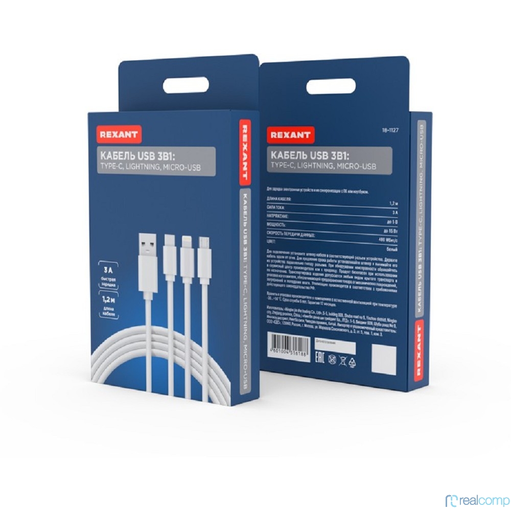 Rexant (18-1127) Кабель USB 3в1 Type-С (3A), Lightning (2,4A), micro USB (2A) 1м, ПВХ