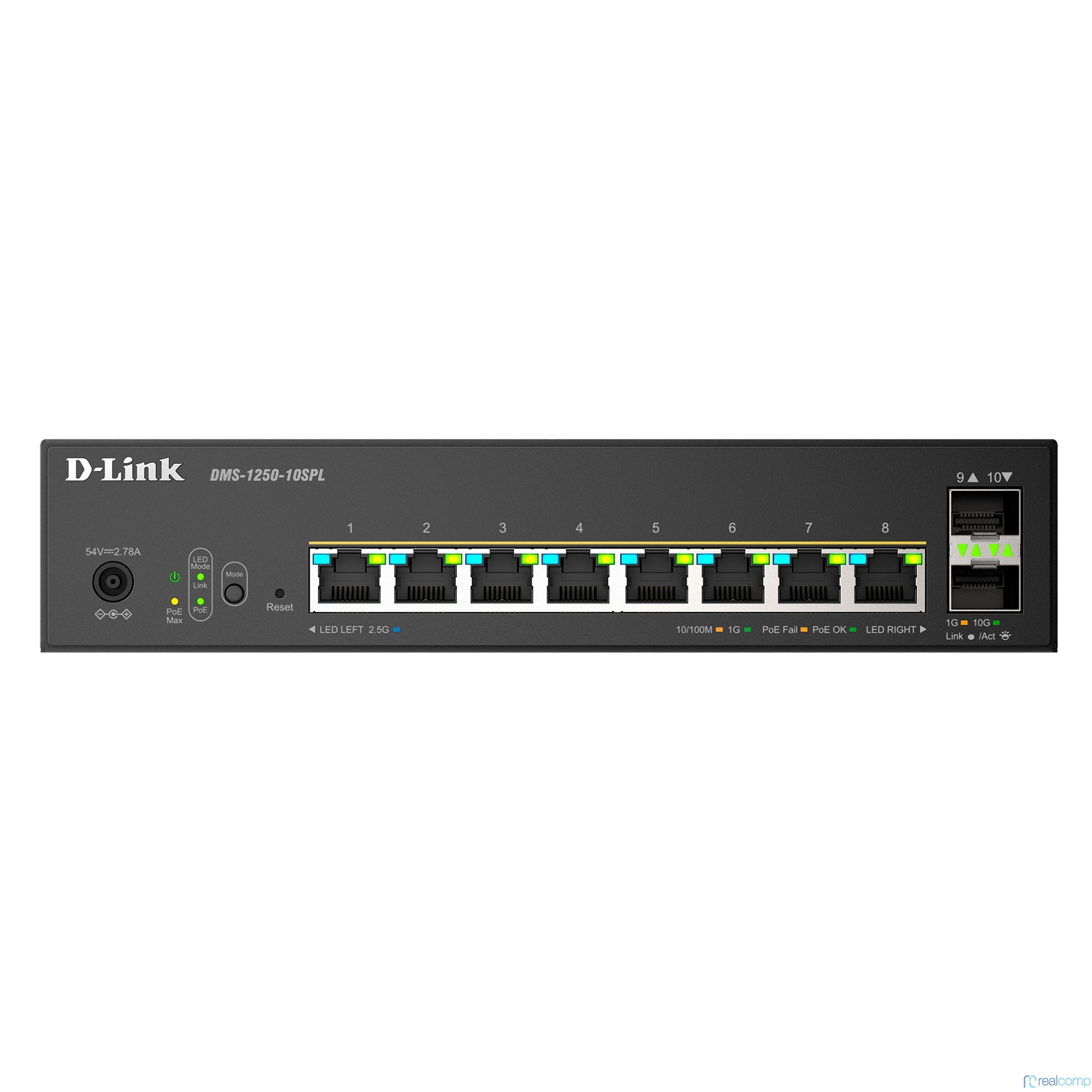 D-Link DMS-1250-10SPL/A1A/6KV Управляемый L2 коммутатор с 8 портами 10/100/1000/2.5GBase-T и 2 портами 10GBase-X SFP+ (порты 1-8 PoE 802.3af/at, порты 1-2 PoE 802.3bt, PoE-бюджет 120 Вт)